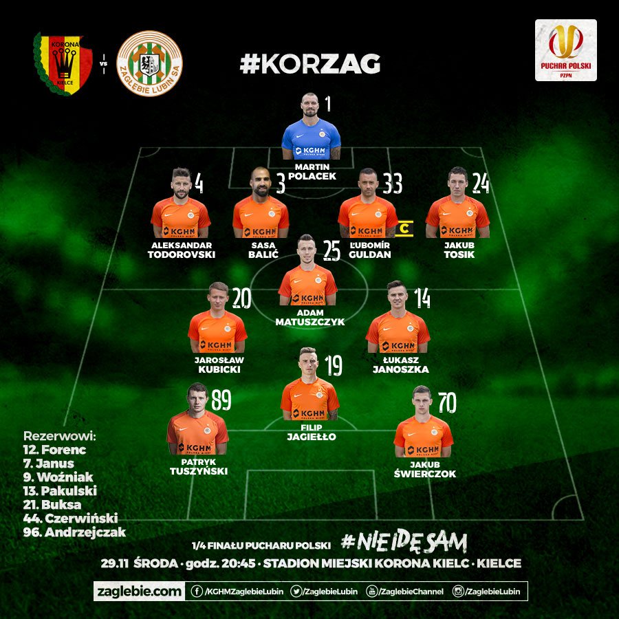 Na powyższej grafice wczorajsze ustawienie i skład Zagłębia Lubin. Na pierwszy rzut oka – wygląda całkiem fajnie, szczególnie blok defensywny. Lewandowski postawił na twardą obronę, której pierwszym i jedynym zadaniem jest destrukcja. Żadne klepeczki, żadne trele-morele, odbiór, wślizg, kasacja. Biorąc pod uwagę problemy zdrowotne kilku piłkarzy – nawet rozsądne wyjście, szczególnie na mecz z Koroną Kielce, finezyjną i przebojową.