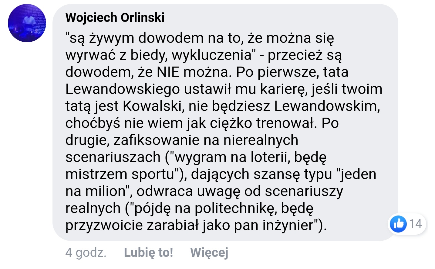 Dużo w ostatnich dniach było dyskusji wokół Roberta Lewandowskiego. Większość z nich była w najlepszym razie pozbawiona smaku, ale najczęściej – pozbawiona sensu. O ile jednak wypowiedzi o tym, że napastnik zarabia za dużo, nosi za drogie zegarki, przyjmuje ordery od niewłaściwych ludzi mogły co najwyżej bawić, o tyle Wojciech Orliński każdego zdrowo myślącego człowieka zwyczajnie wkurwił. Były dziennikarz m.in. Gazety Wyborczej zarzucił bowiem na Facebooku, że Lewandowskiemu karierę… ustawił ojciec.