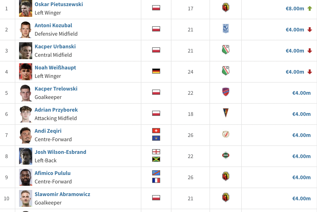 Chodzi oczywiście o Oskara Pietuszewskiego, który według portalu jest wart aż osiem milionów euro. Choć, jak przyznawał Ziemowit Deptuła w WeszłoTV, oficjalnej ceny za niego nie ma: – Na chwilę obecną nie ma kwoty, za którą moglibyśmy go sprzedać, bo nie ma tematu transferu Oskara. Patrzy się na to, co się pisze w internecie na temat setek ofert – spokojnie. Nie było żadnej oferty na serio. Gdyby była, to bym wiedział. A jeśli ktoś dzwoni i zapyta: „Łukasz, a ile za tego Oskara”, no to…